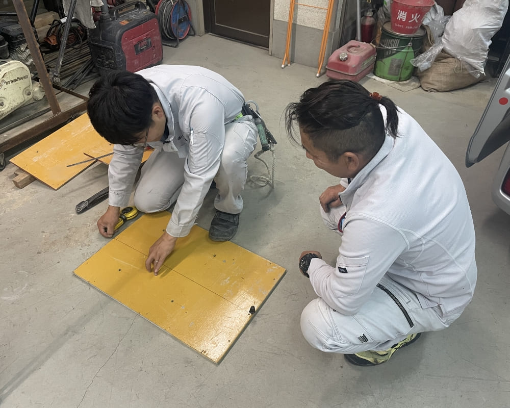 次に現場で使用する材料や、作業を行うのに必要な工具の段取りを覚えてもらいます。